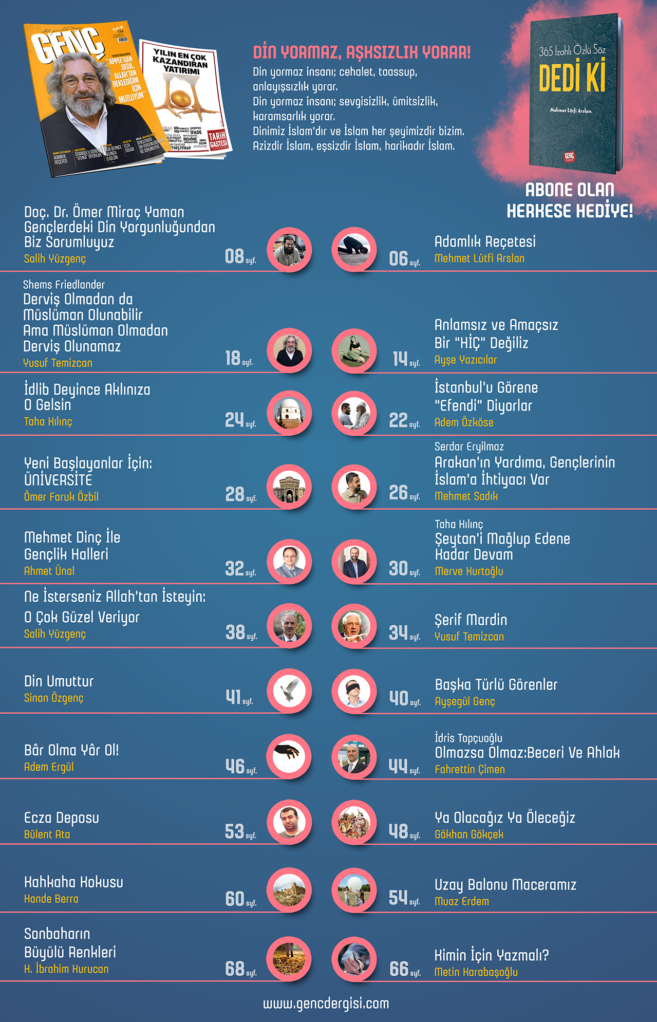 Abone olmak isteyenlere Genel Yayın Yönetmeniz Mehmet Lütfi Arslan’ın hazırladığı ”365 İzahlı Özlü Söz - DEDİ Kİ” hediye. Abone olmak için: abone@gencdergisi.com veya 0212 671 07 00 / 178