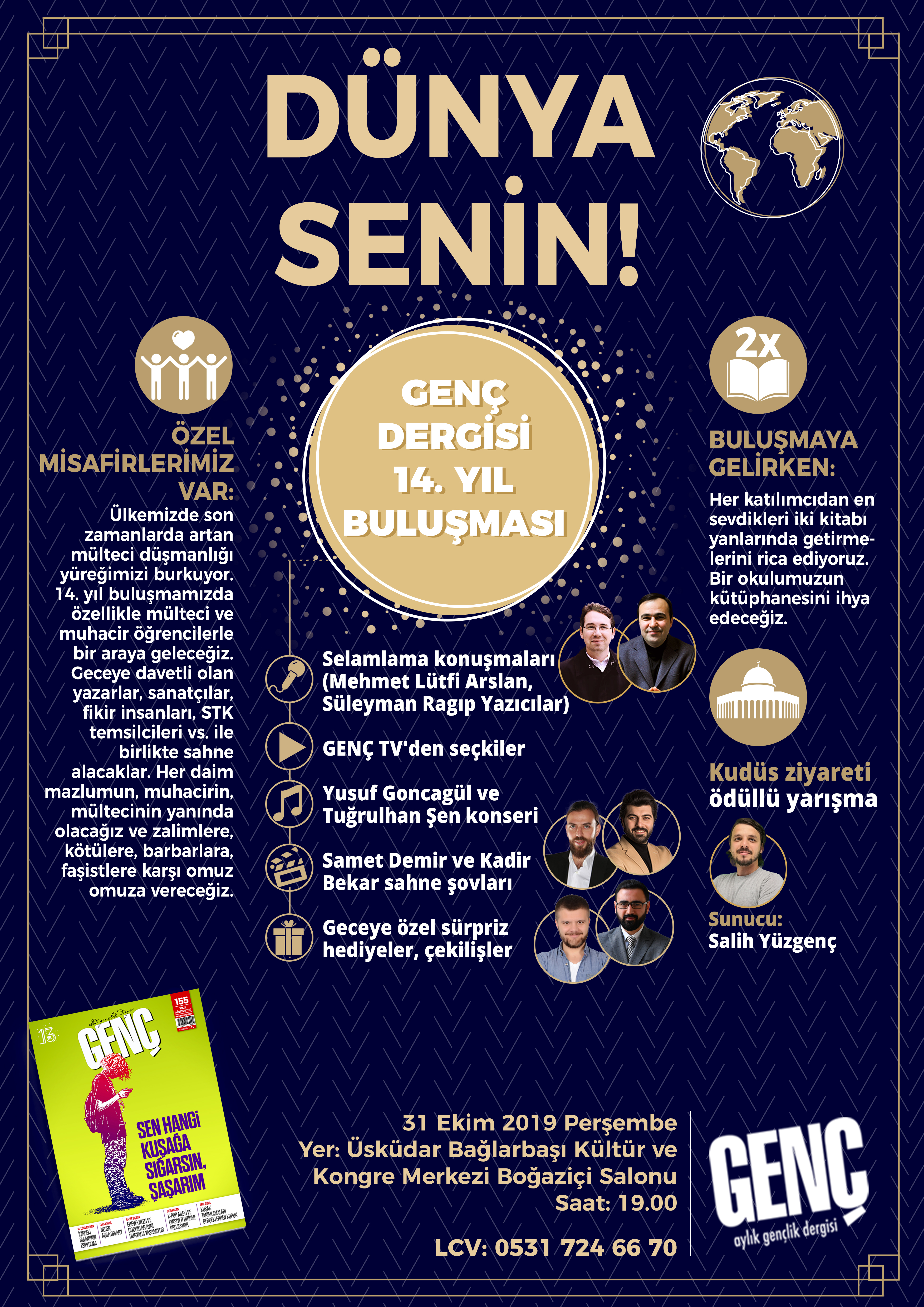 Ebedî gençlik derdiyle 14. yılına giren GENÇ Dergisi, öncüleri, yazarları, fikir insanları, STK temsilcileri ve derdine gönül verenleri ile "Dünya Senin" diyerek buluşuyor!