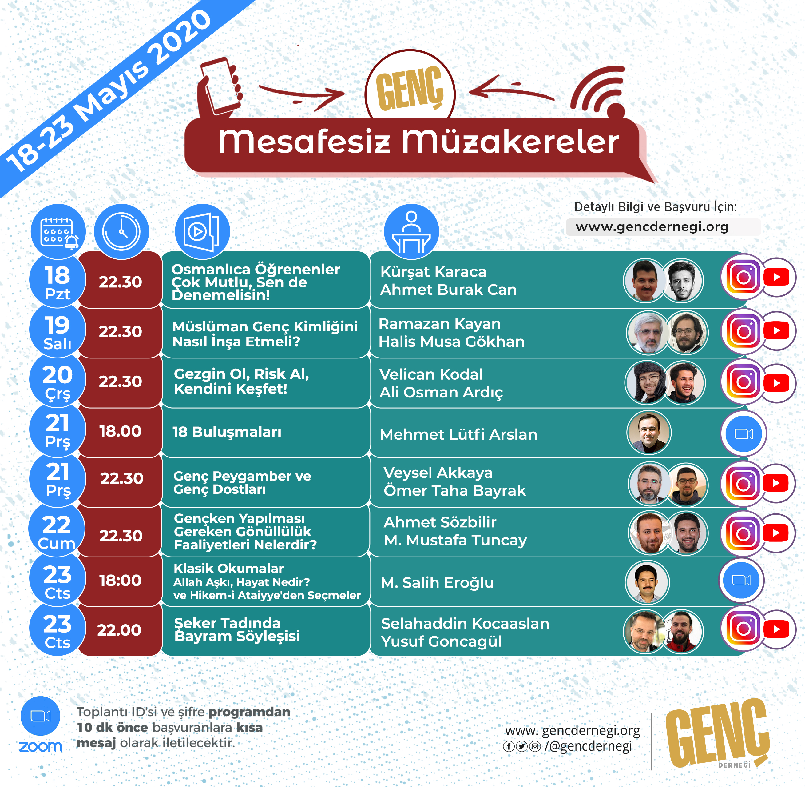 Bu hafta GENÇ, Mesafesiz Müzakereler programları kapsamında yine çok özel programlarla sizlerle buluşuyor. Haftalık (18 - 23 Mayıs) Mesafesiz Müzakereler programları şöyledir: