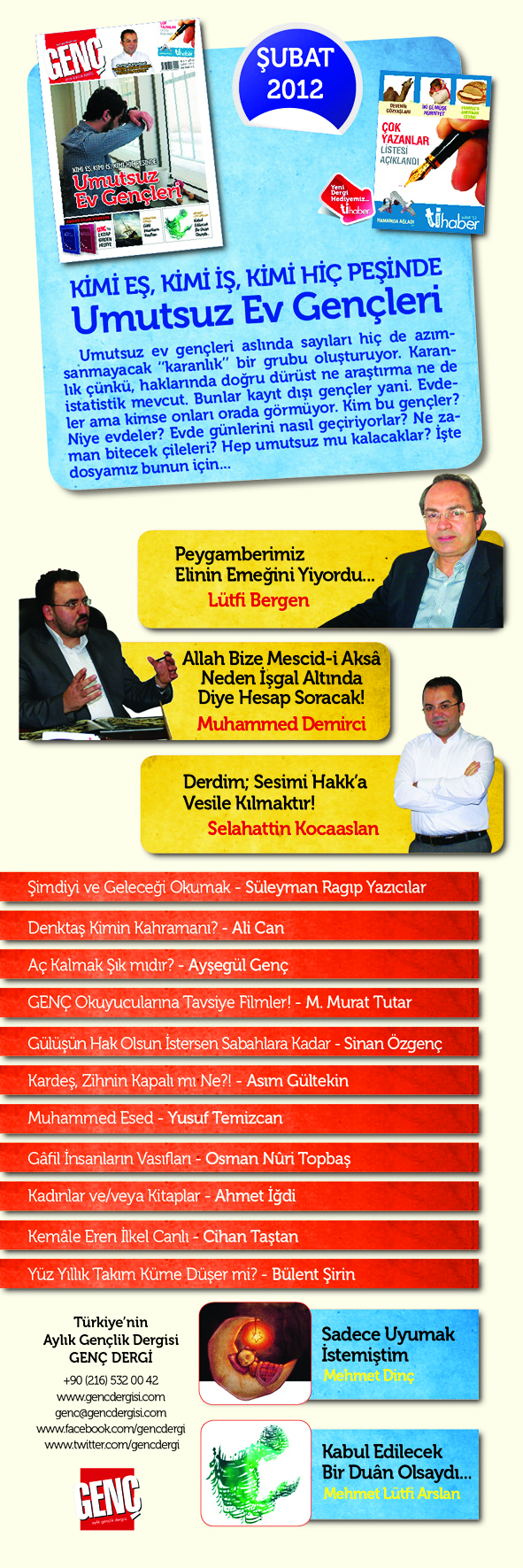 “Umutsuz Ev Gençleri” dosyamız ev ile aramızdaki bu ilişkinin hiç görünmeyen bir boyutuna temas etmek için hazırlandı. Ev ile dışarısı arasındaki irtibatı yukarıda anlattığımız şekilde anlamadığı için eve tıkılıp kalmış, bu yüzden de umutsuzluğa düçar olmuş sayısı meçhul genç bir kitle var. Bu gençlerin umutsuzluğu sadece kendilerini vurmuyor, evin sıcaklığını da tehdit ediyor. Evdeki sıcaklık en büyük zenginliğimizdir, onu kaybettik mi uçurumun kenarına gelmişiz demektir. Bu açıdan dosyamızı ilginç bulacağınızı düşünüyoruz. Dosyamız, sadece umutsuz ev gençlerinin durumuna dikkat çekmekle kalmıyor, onların evin dışına çıkabilmeleri noktasında bir takım teklifler de sunuyor.