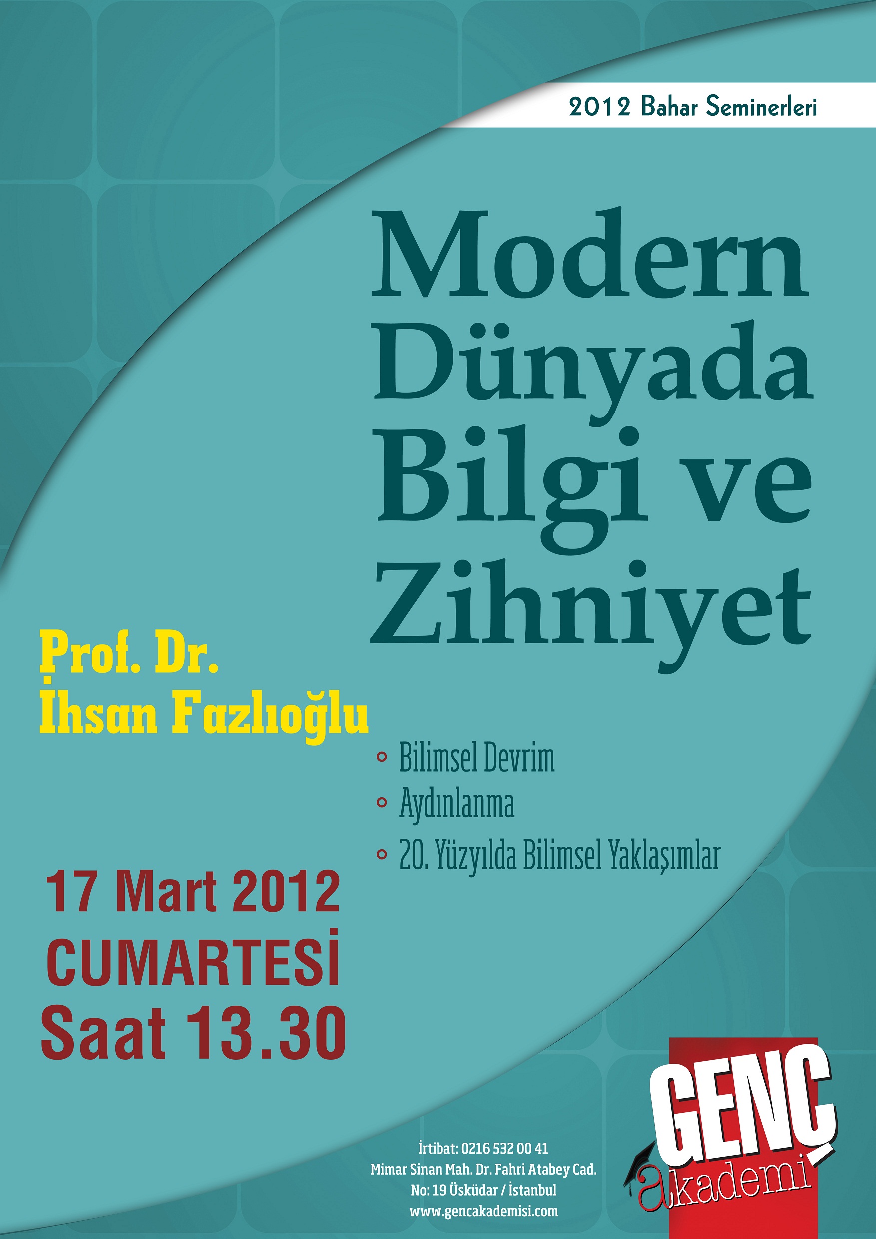 Genç Akademi Bahar Seminer Programları kapsamında, İstanbul Medeniyet Üniversitesi Öğretim Üyesi Prof. Dr. İhsan Fazlıoğlu, 17 Mart Cumartesi saat 13.30`da Modern Dünyada Bilgi ve Zihniyet başlıklı bir seminer verecek. Katılmak isteyen herkese duyurulur...
