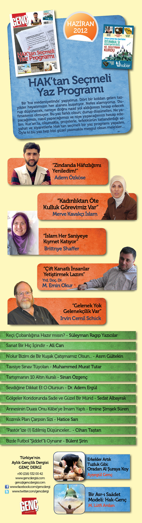 Mayıs tam bir sefer ayı oldu. Ağrı, Patnos, Erzurum, Kütahya, Bursa, Batman, Şırnak, İzmir, Tavşanlı ve Karabük GENÇ programları ile heyecan tazeledi. Biz de tazelendik tabii bu arada. Dostlara ayrı ayrı teşekkür ediyoruz. Varolsunlar, gönüllerini açtılar. Haziran’da ise Uluslararası GENÇ Derneğimiz vasıtası ile Afrika’ya gidecek GENÇ Gönüllülerin tatlı telaşı saracak hepimizi. Taze heyecanları ile kara kıtanın yoluna düşecekler kardeşlerimiz. Bu arada derneğimiz ülkemizdeki misafir öğrencilerle ilgili önemli görevler üstlenecek bir noktaya geldi. Ümit ve dua ediyoruz: “Dünya Bizi Bekliyor” muhtevasında bir hizmet ufku ellerimizi hiç bırakmasın.