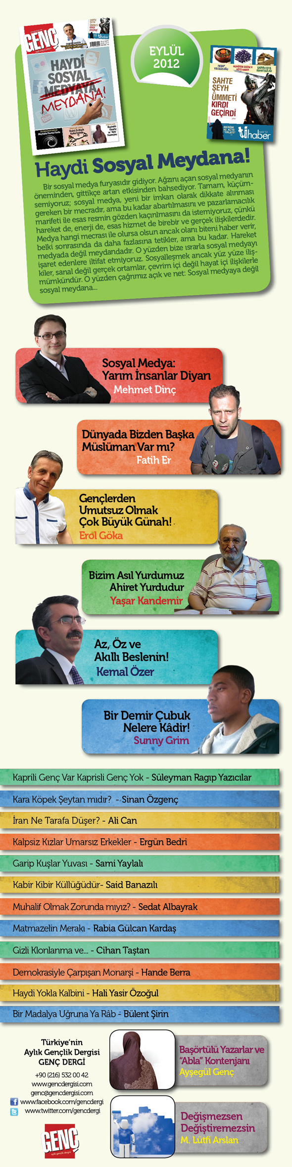 GENÇ gözü açıkların dergisi oldu hep; bu dergiyi okuyanlar dünyaya, alâyişine kapılmayacak kadar uzak ve fakat yine ötelerin sermayesinin burada kazanılacağını bilecek kadar her şeye aşina oldular. Biz hep uyanık kaldık, çünkü GENÇ bize uyanıkken rüya görmeyi öğretti. Bize “hem bu hayatı yaşarız, hem bu hayatı aşarız” dedirtti. Biz, ondan aldığımız heyecanla dünyaya “hem kendimizi sana sevdirir, hem de seni sevmeyiz” diye meydan okuduk. “Hem kana kana içeriz buraları, hem bir yudum bile nasiplenmeyiz, hem her şeyden haberdar oluruz, hem her şeyden bihaber kalabiliriz, zahirde bigâne sanırlar bizi, derundan aşinayız” dedik. Böyle söyledik, böyle bildik, halimize de buna göre çekidüzen verdik, uyanıkken gördüğümüz rüyamıza sadakatimizi hiç terk etmedik. İşte bu bakış, bu duruş ve bu heyecanla yeni bir seneye daha başlıyoruz. Hiç bitmemek, hiç eskimemek, hiç pörsümemek, hep GENÇ kalmak, ebedi mutluluğa doğru giden doğru yolun doğru yolcusu olmak için… Bizimlesiniz değil mi? Mübarek olsun.