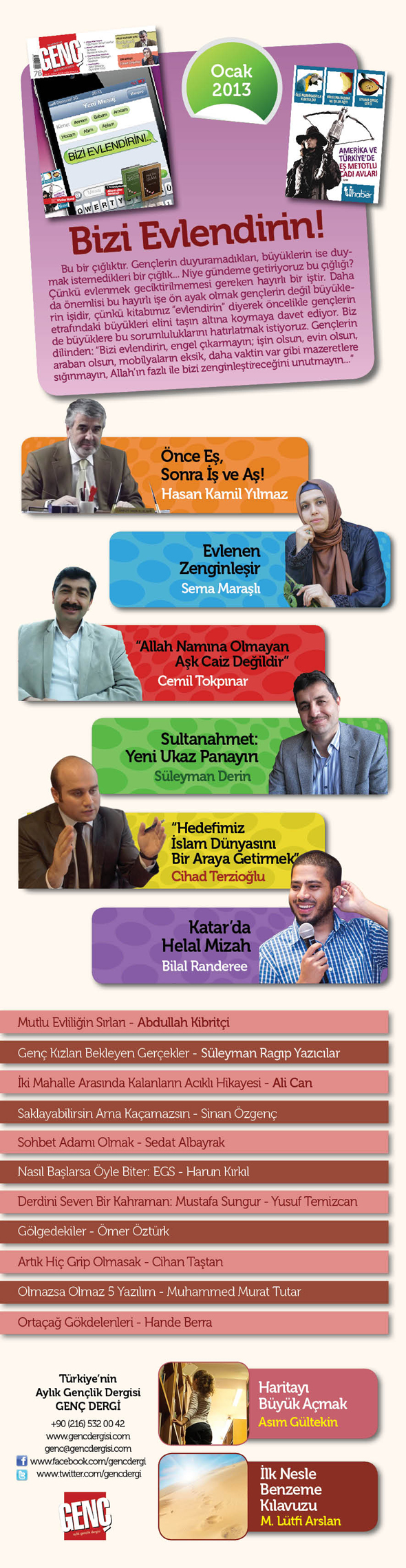 Bu ay “Bizi Evlendirin” kapağıyla çıkıyoruz. “Bizi Evlendirin” çağrısını duymayan da buradaki espriyi anlamayan da kalmasın. Evlendirmek meselesi büyüklerin düğmeye basarak başlatacağı bir konudur. Bu işe ön ayak olmak gençlerin işi değil, çünkü kitabımız “içinizdeki bekârları evlendirin” buyuruyor. O yüzden biz de çağrımızı büyüklere yöneltiyoruz: “Gençleri evlendirin. Ama bunu yaparken işin olsun, evin olsun, araban olsun, mobilyaların eksik… gibi engeller koymayın. Nikâhta keramet vardır, bunu görün.”